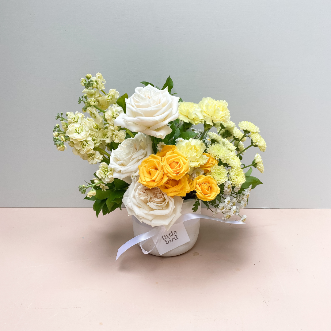 Wild Bloom is sunshine in bouquet form — a lively mix of golden yellow, lemon, and fresh whites. Designed to lift spirits and light up a room, this joyful arrangement is perfect for celebrations, get well wishes, or new beginnings.